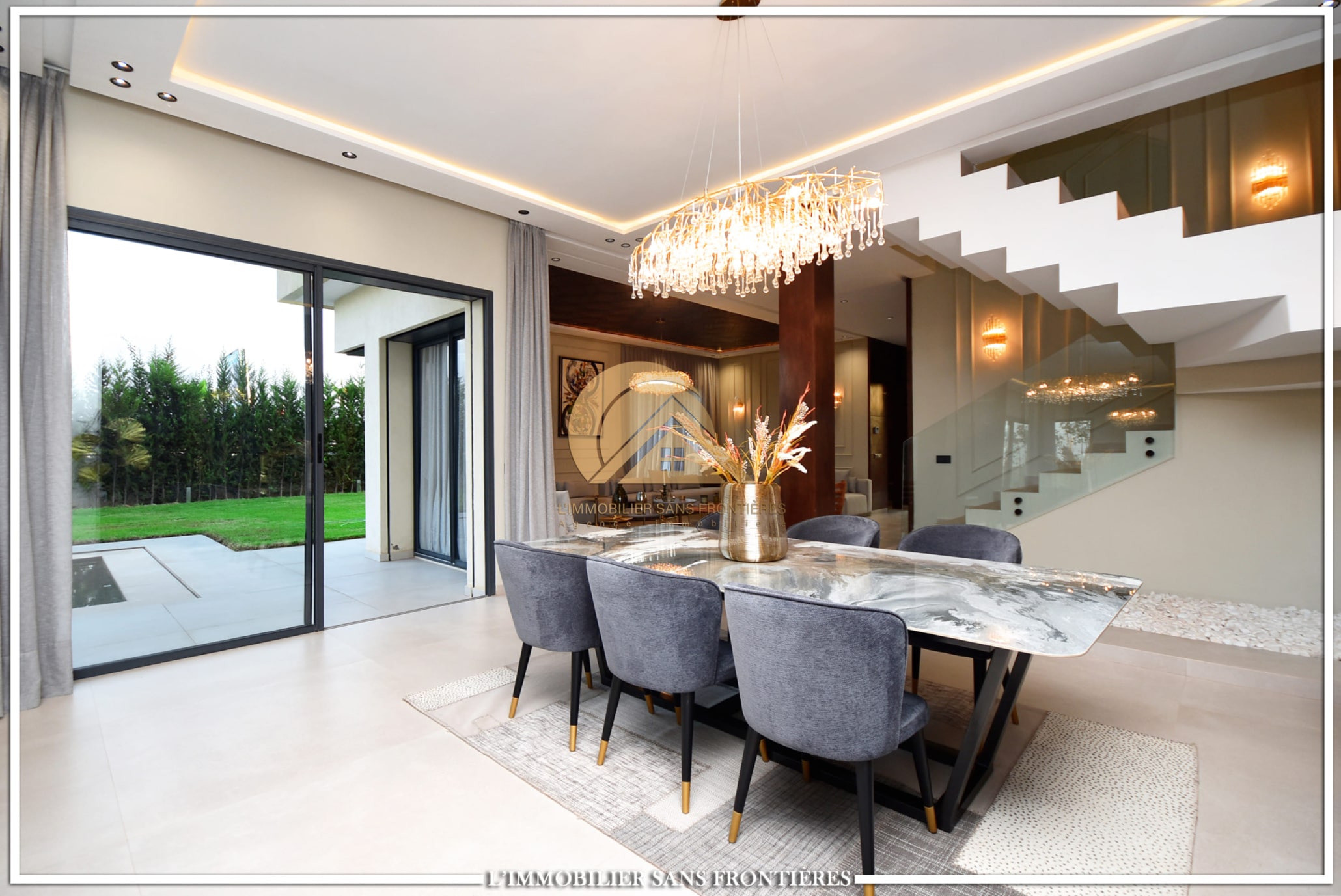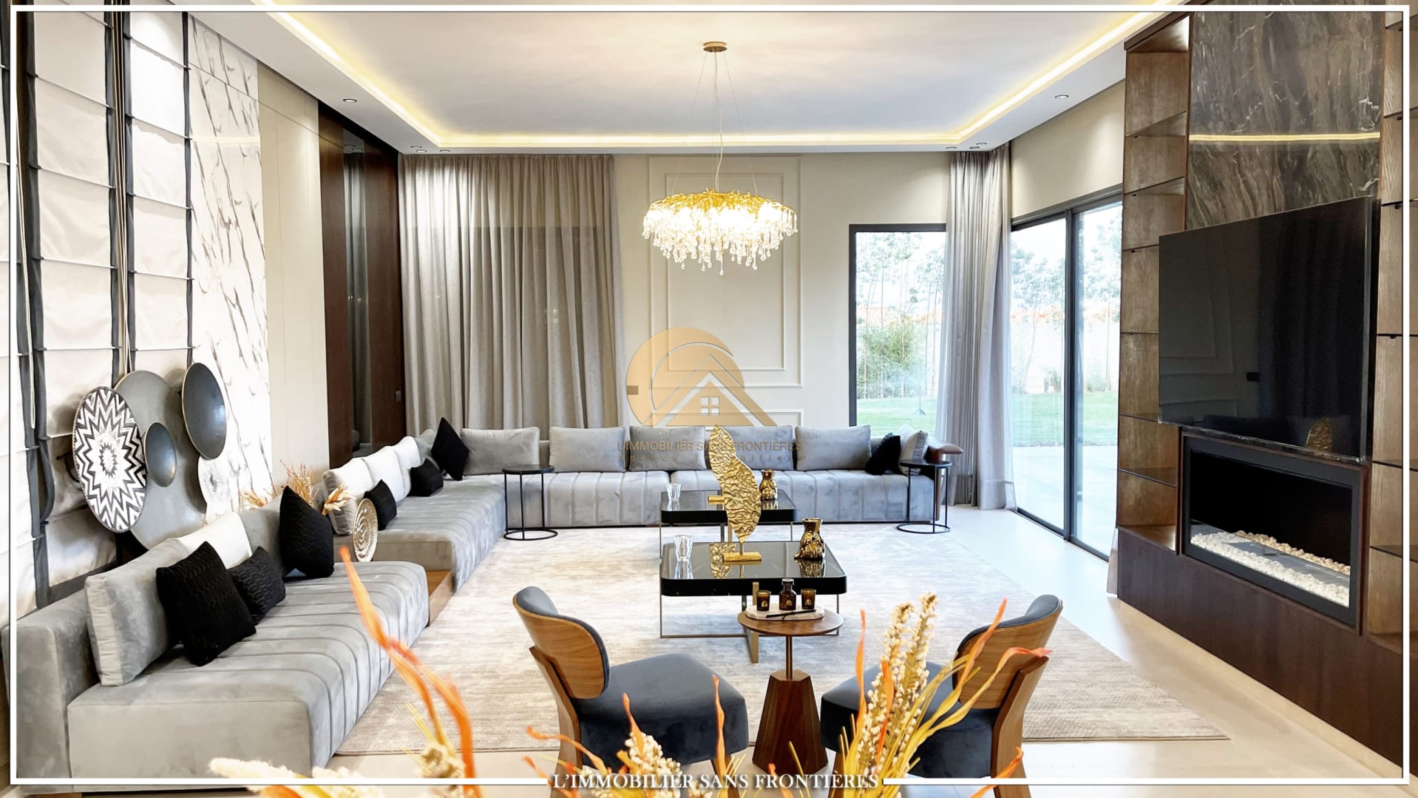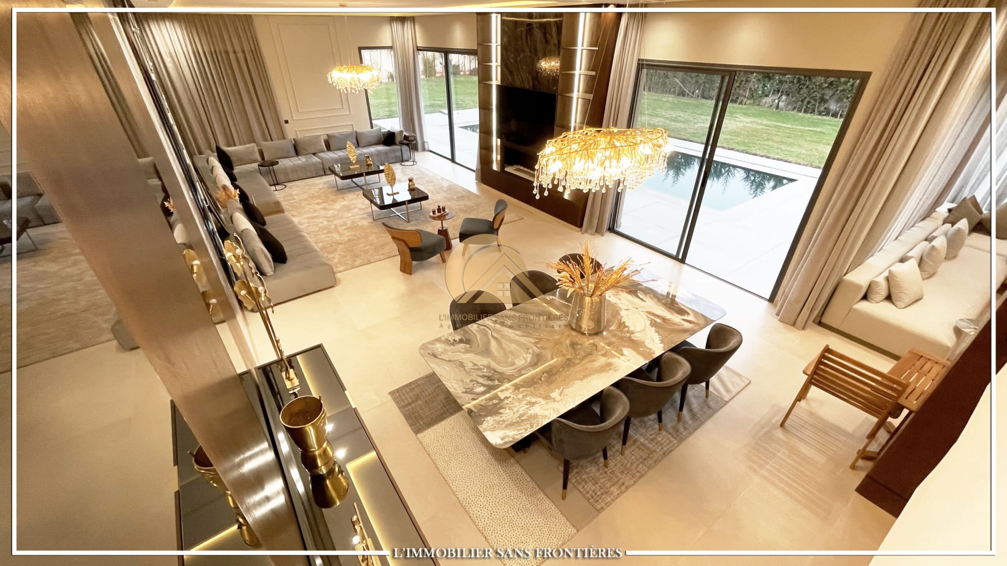 Stated finishes: marble and MDF wood – Fireplace – Equipped kitchen – Terraces – Pool views